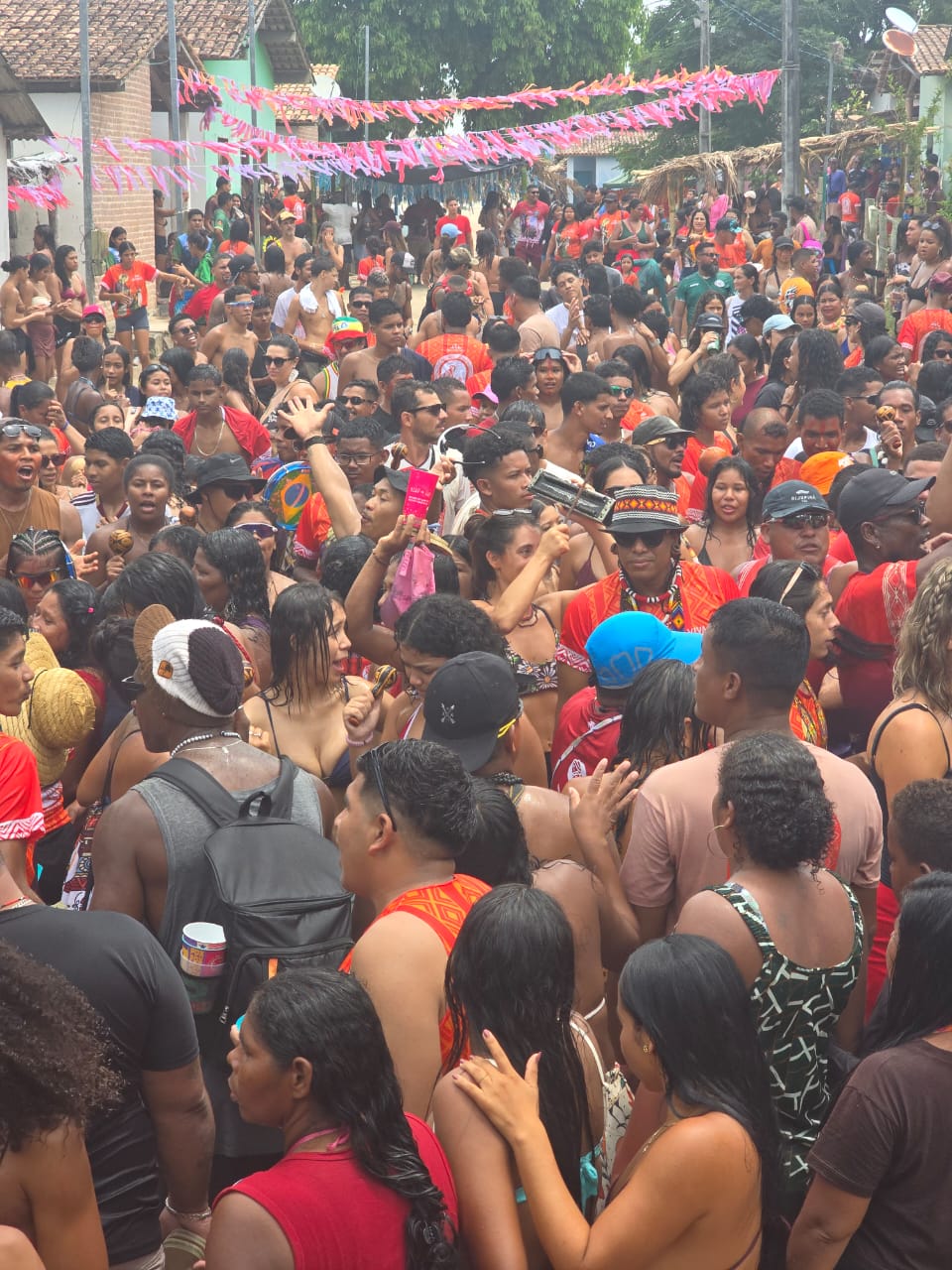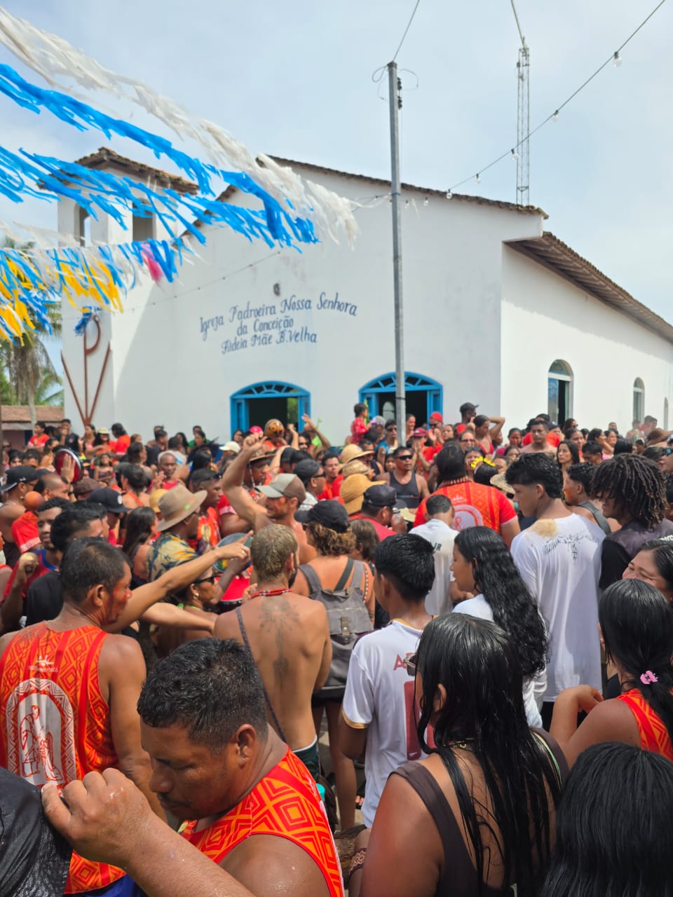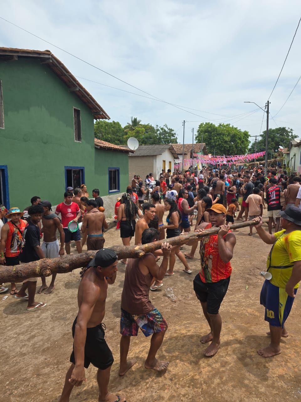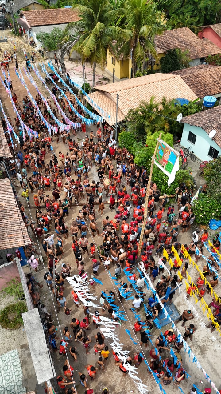 No dia principal, 3 de fevereiro, um dos rituais mais simbólicos mobilizou a aldeia: a ida até a mata, no caminho da Aldeia Pará, para buscar o pau de São Braz, retirado tradicionalmente da região da casa do velho Antônio Braz, importante ancião e referência comunitária. Durante o cortejo, o tronco percorreu as casas, onde era raspado como gesto de bênção e proteção. As cascas foram lançadas para dentro das residências e também preservadas como parte das práticas de cura, enquanto os moradores consagravam o pau com bebida, mantendo viva a tradição.