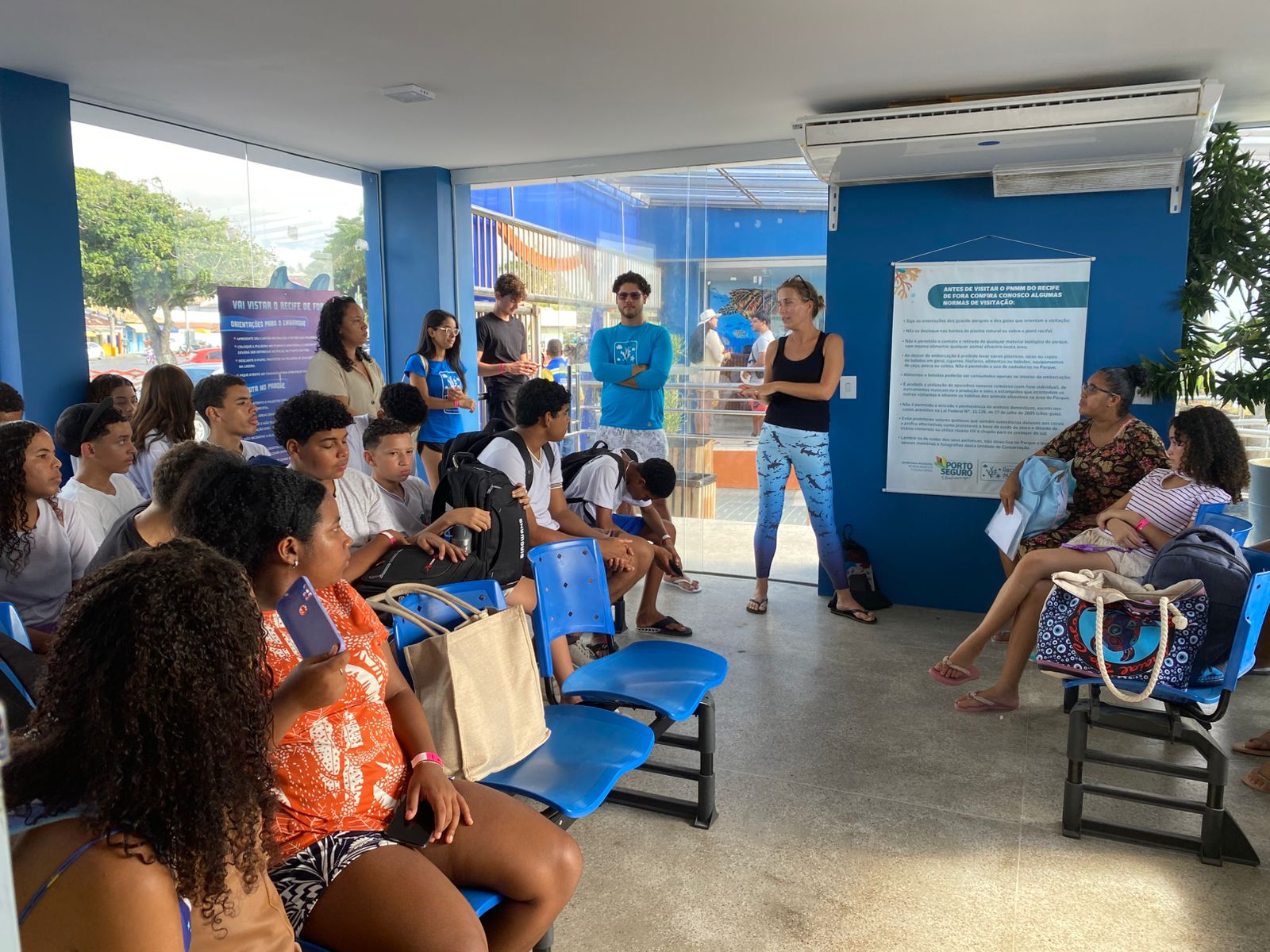 Durante a visita, os alunos receberam orientações sobre os recifes de coral e a biodiversidade presente na unidade de conservação. A programação incluiu palestra educativa sobre a vida marinha e uma experiência prática na Piscina de Visitação, permitindo que os estudantes observassem de perto espécies e formações naturais que compõem um dos ambientes marinhos mais importantes da região.