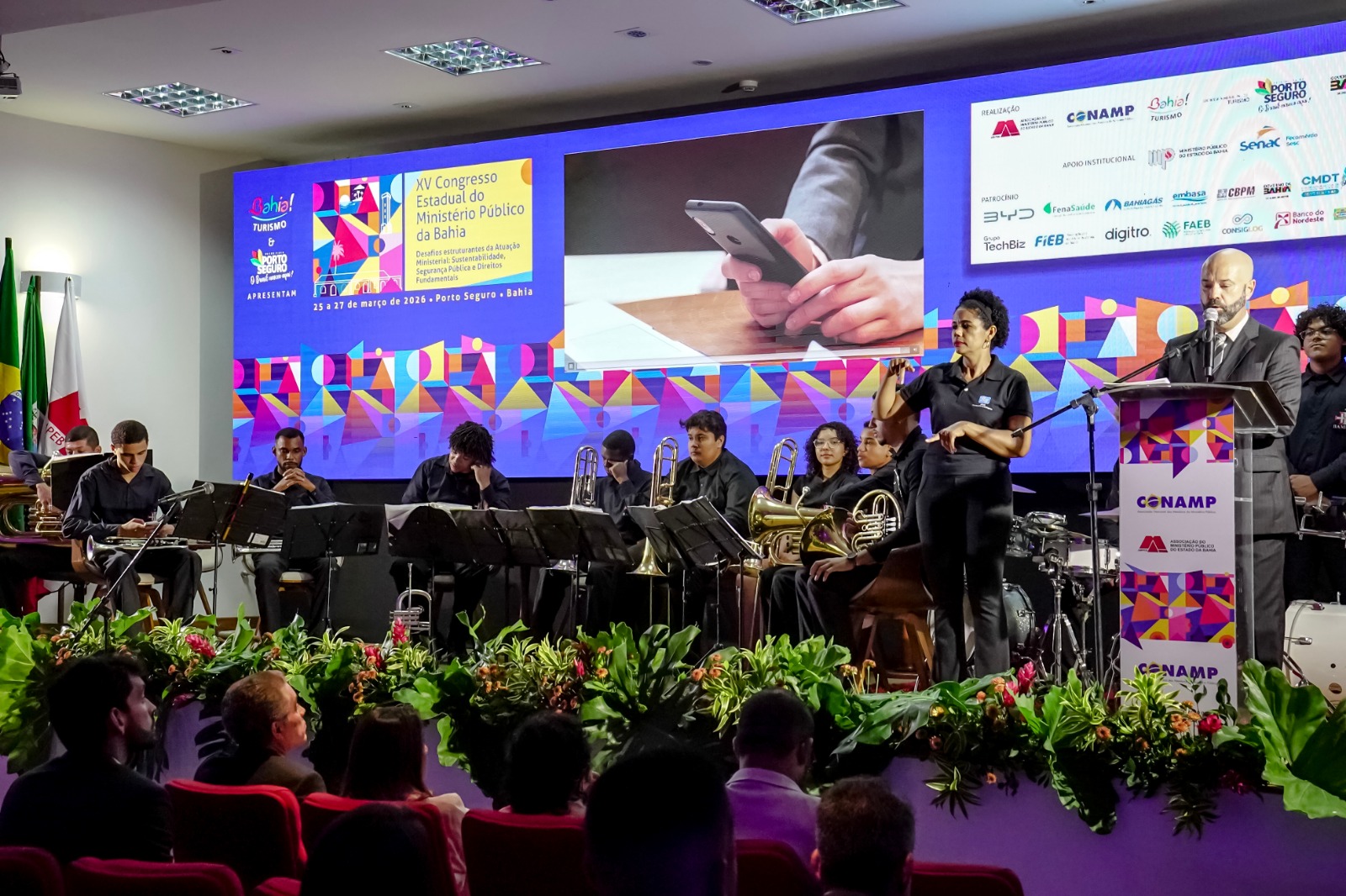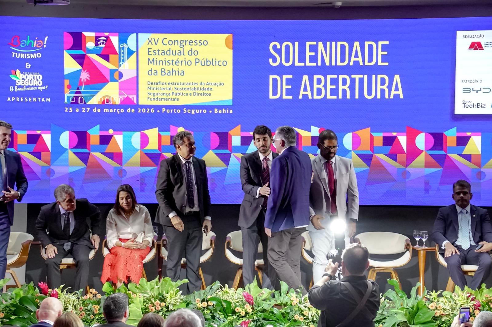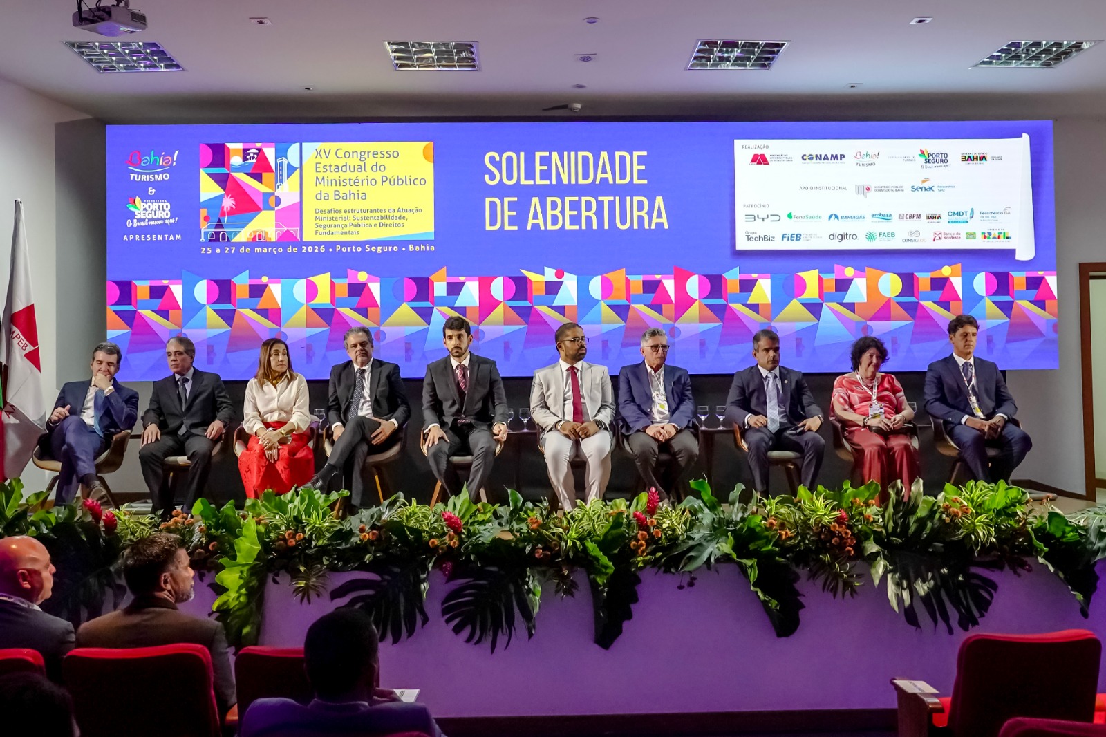 A solenidade de abertura contou com a presença do prefeito Jânio Natal, acompanhado do vice-prefeito Paulo Onishi, que deram as boas-vindas aos participantes à Terra Mãe do Brasil, recebendo o presidente da AMPEB, Lucas Santana, representando o presidente da CONAMP, Tarcísio Bonfim; o secretário de Justiça e Direitos Humanos da Bahia, Felipe Freitas, representando o governador Jerônimo Rodrigues; a procuradora-geral adjunta do MP-BA, Wanda Valbiraci, representando o PGJ Pedro Maia; o conselheiro do CNJ, João Paulo Santos Schoucair; o corregedor-geral do MP-BA, Paulo Marcelo Santana Costa; a ouvidora-geral do MP-BA, Elna Leite Ávila Rosa; o coordenador das Promotorias de Porto Seguro, Bruno Gontijo; e a superintendente do Senac Porto Seguro, Nancy Costa.