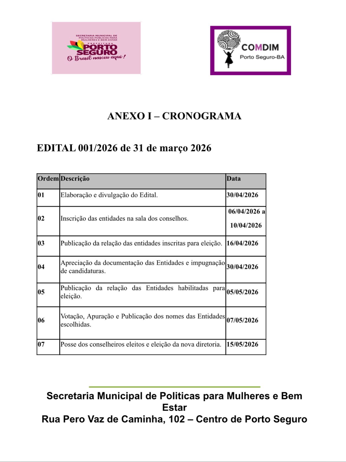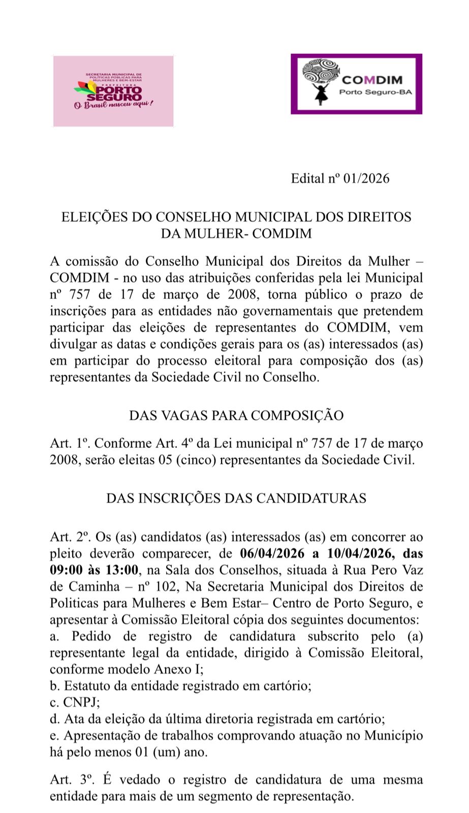 Estão abertas, até o dia 10 de abril, as inscrições para as entidades não governamentais interessadas em participar das eleições de representantes do COMDIM (Conselho Municipal dos Direitos da Mulher). Os pretendentes a uma cadeira no conselho deverão comparecer Secretaria Municipal dos Direitos de Políticas para Mulheres e Bem Estar, situada à Rua Pero Vaz de Caminha, nº 102, apresentando à Comissão Eleitoral cópia dos documentos exigidos.