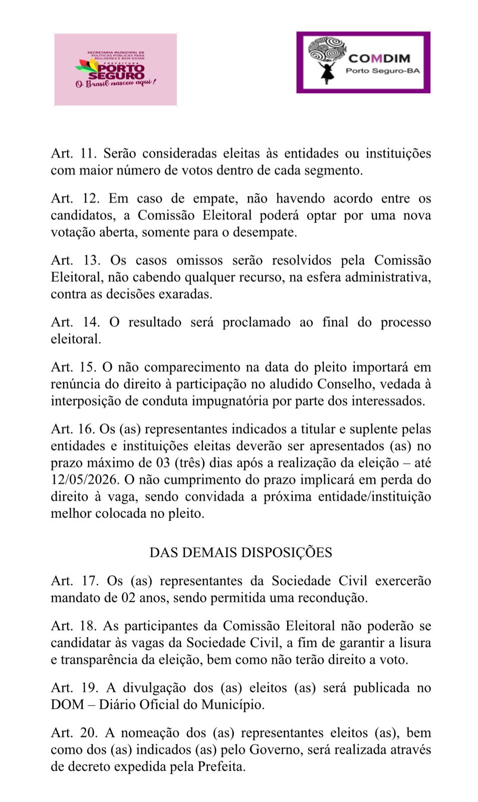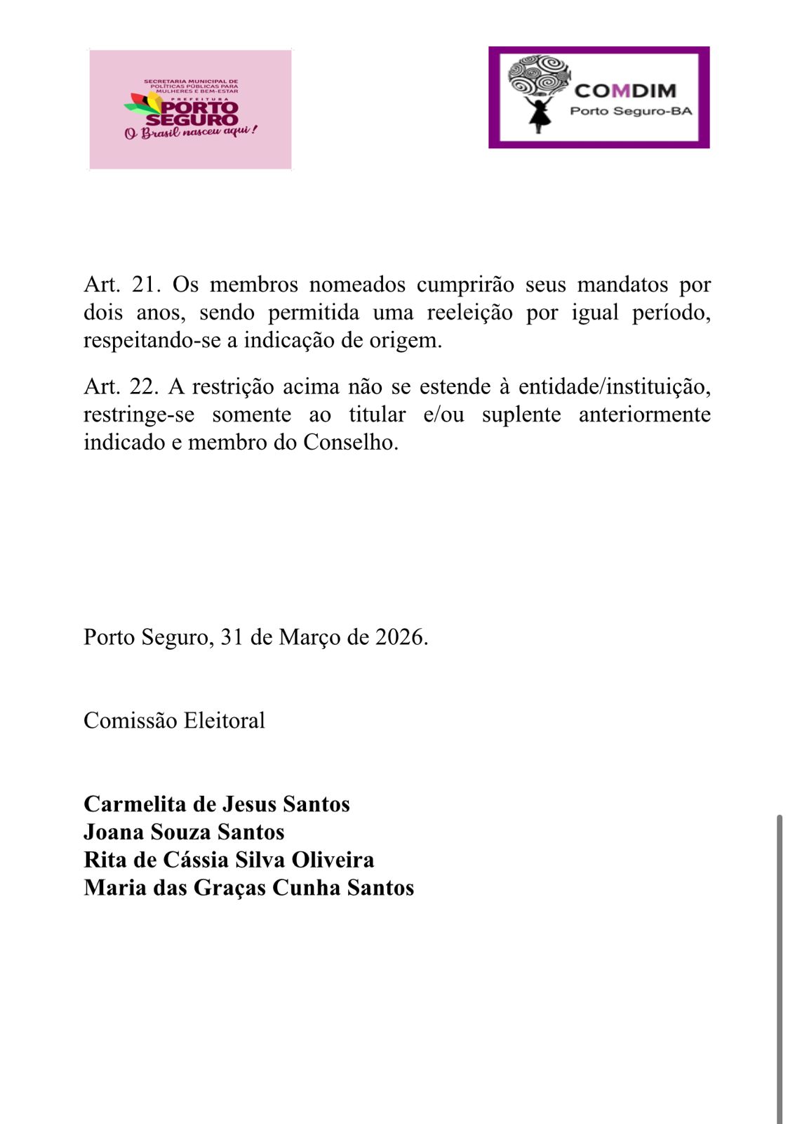 Os representantes da Sociedade Civil exercerão mandato de 02 anos, sendo permitida uma recondução. A divulgação dos eleitos será publicada no Diário Oficial do Município.