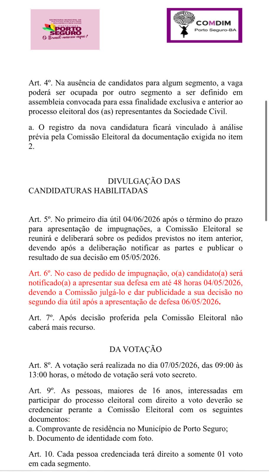 A votação dos novos membros será realizada no dia 07/05, das 09:00 às 13:00 horas, por meio de voto secreto. Para participar, os interessados, maiores de 16 anos, deverão se credenciar junto à Comissão Eleitoral com os seguintes documentos: Comprovante de Residência no Município de Porto Seguro e Documento de Identidade, com foto.