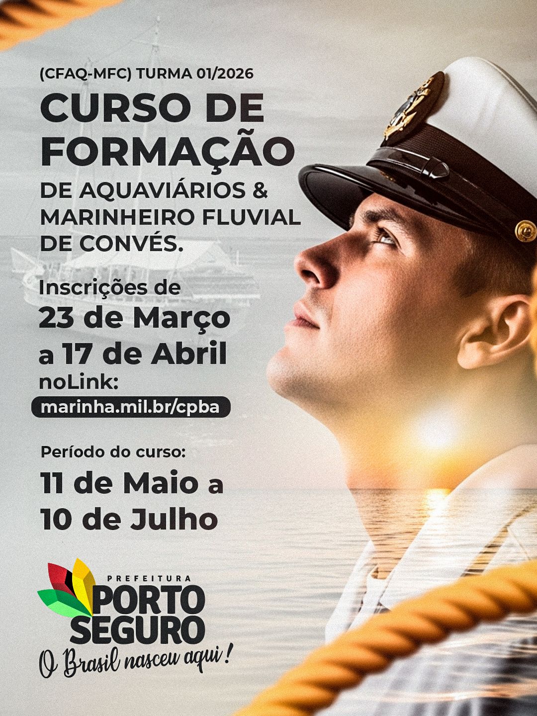 A Delegacia da Capitania dos Portos em Porto Seguro divulgou o edital do Curso de Formação de Aquaviários – Marinheiro Fluvial de Convés (CFAQ-MFC), turma 01/2026, uma oportunidade direta de qualificação profissional voltada ao transporte de passageiros na região, que desde 2022 não ocorria na cidade. As inscrições acontecem de 23 de março a 17 de abril, com curso previsto entre 11 de maio e 10 de julho. O edital está disponível no site da CPBA (https://www.marinha.mil.br/cpba/) e no Grupo de Atendimento ao Público (GAP) da DelPSeguro.