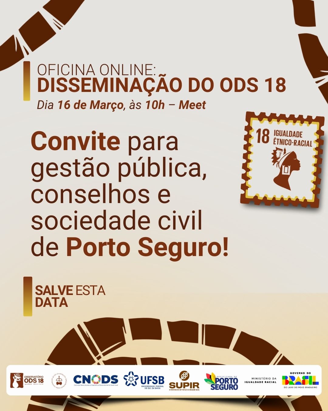 A agenda de promoção da igualdade racial ganha destaque em Porto Seguro com a realização da oficina online “Disseminação do ODS 18”, marcada para o dia 16 de março, às 10h. A atividade é promovida pelo Observatório ODS 18 da Universidade Federal do Sul da Bahia (UFSB), em parceria com a Prefeitura de Porto Seguro, por meio da Superintendência de Promoção da Igualdade Racial e do Conselho Municipal de Promoção da Igualdade Racial.