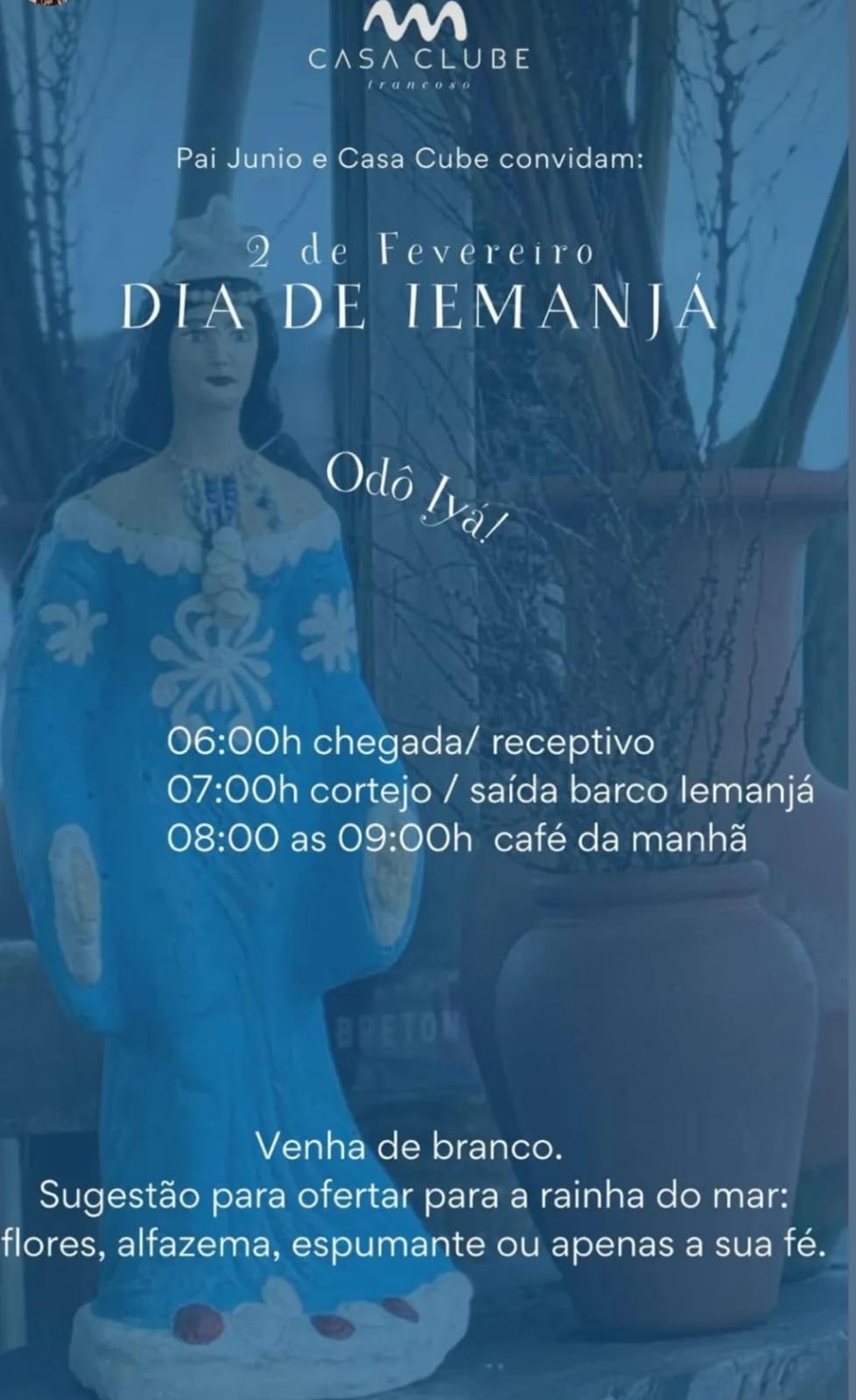 Em Trancoso, a celebração também ganha destaque com forte representatividade de vários terreiros e grupos locais, que realizam homenagens em diversas localidades e praias. Entre as festividades, uma das mais conhecidas é a que tem concentração no Quadrado, reunindo atenção de moradores e visitantes por seu percurso simbólico no coração do distrito. O terreiro Île Airá Modé Oya Aféfé Àsé Ajàgúnà, sob condução de Pai Rony de Airá, sai do terreiro em Coqueiro Alto às 9h30. Ao chegar, o grupo se organiza na rua próxima ao Colégio Municipal e segue em direção ao Quadrado de Trancoso, onde realiza uma parada de 15 minutos para agradecimentos. Em seguida, o cortejo segue para a praia, permanecendo por cerca de 1 hora para a entrega.