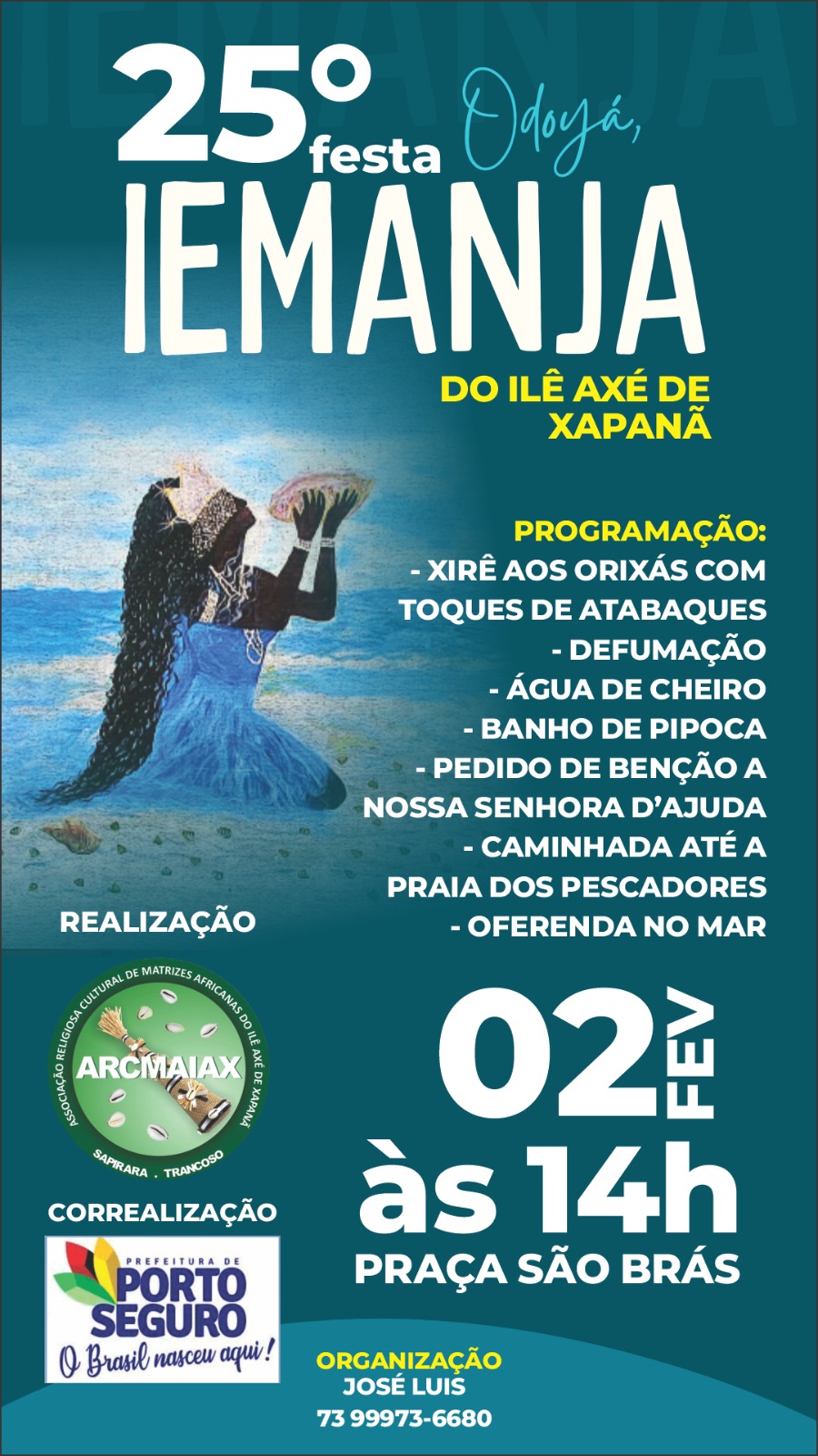 A festa mais tradicional acontece em Arraial d’Ajuda, já em sua 25ª edição, com início na Praça São Brás e grande mobilização comunitária. A expectativa é reunir mais de 4 mil pessoas, entre turistas e moradores, com a participação de mais de 40 baianas, em um encontro de celebração e identidade. A programação da Festa de Iemanjá do Ilê Axé de Xapanã inclui xirê aos orixás com toques de atabaques, defumação, água de cheiro, banho de pipoca, pedido de bênção a Nossa Senhora d’Ajuda, caminhada até a Praia dos Pescadores e oferenda no mar, sob organização do pai, José Luis.